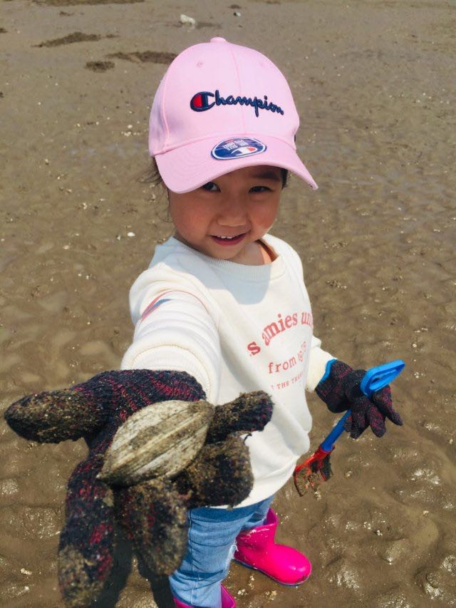 很快,我们就挖到小半桶的花蛤,另外还捡了一些泥螺。在这里也给大家“科普”一下赶海的技巧(这也是景区工作人员告诉我们的):花蛤是群居性的海生物,一般刨个几耙子,如果都没有收获的话就尽快挪窝,换别处去挖,如果有的话一下子能挖很多,后面有去赶海的小伙伴可以来告诉我这个技巧是否实际有效哈